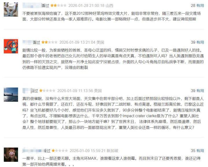 可谁曾想,此片所展现的灾难画面非常少,大部分情节都是主角一家人的艰难旅行,整体显得非常无聊,不少人都表示:“给自己看困了”。