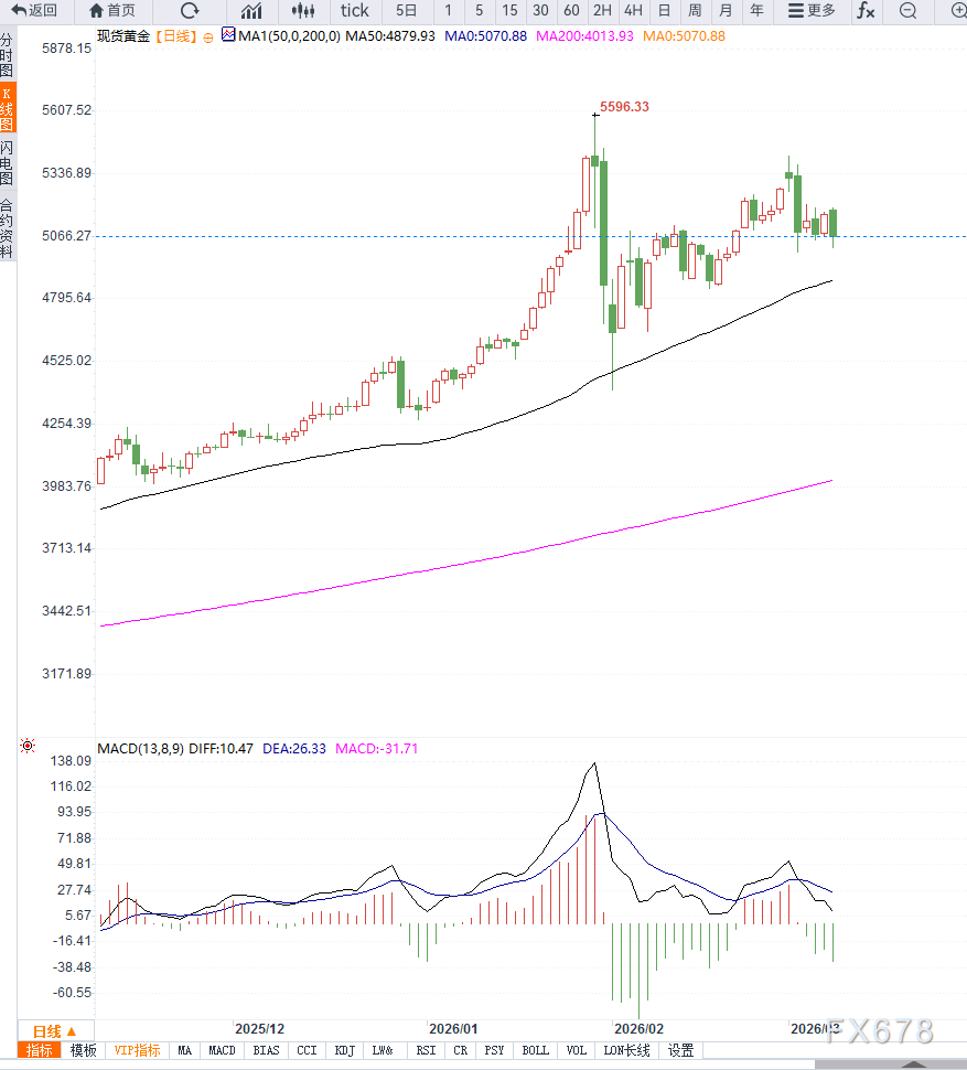 本周市场焦点:本周最受关注的经济数据将是美国消费者通胀报告。市场将密切关注即将公布的美国CPI数据。如果通胀数据高于预期,市场可能进一步推迟降息预期,从而对黄金构成压力。相反,如果通胀出现明显回落,则可能重新提振黄金需求。从技术面来看,黄金近期上涨后出现高位调整迹象。日线图显示,金价此前一度冲击历史高位,但短线出现技术性回落。关键技术位置:第一支撑:5000美元,第二支撑:4950美元。上方阻力:5100美元,强阻力:5200美元。